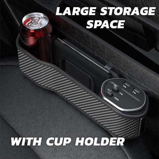 Multifunctional Car Front Seat Gap Filler Storage Box with Dual USB Ports, Type C, IOS Fast Charging Cables and Cup Holder