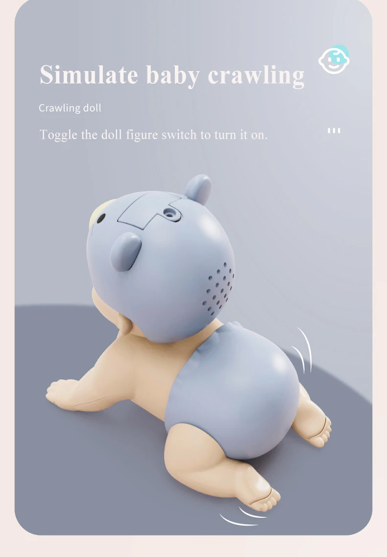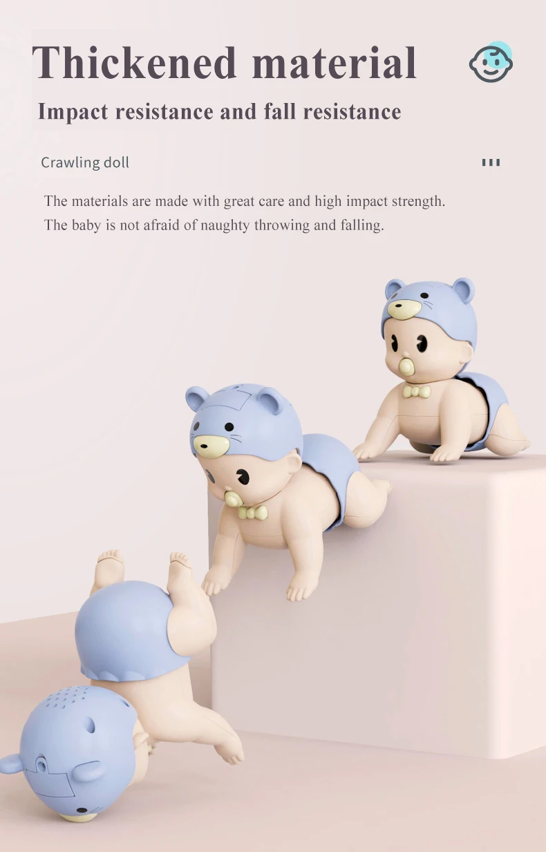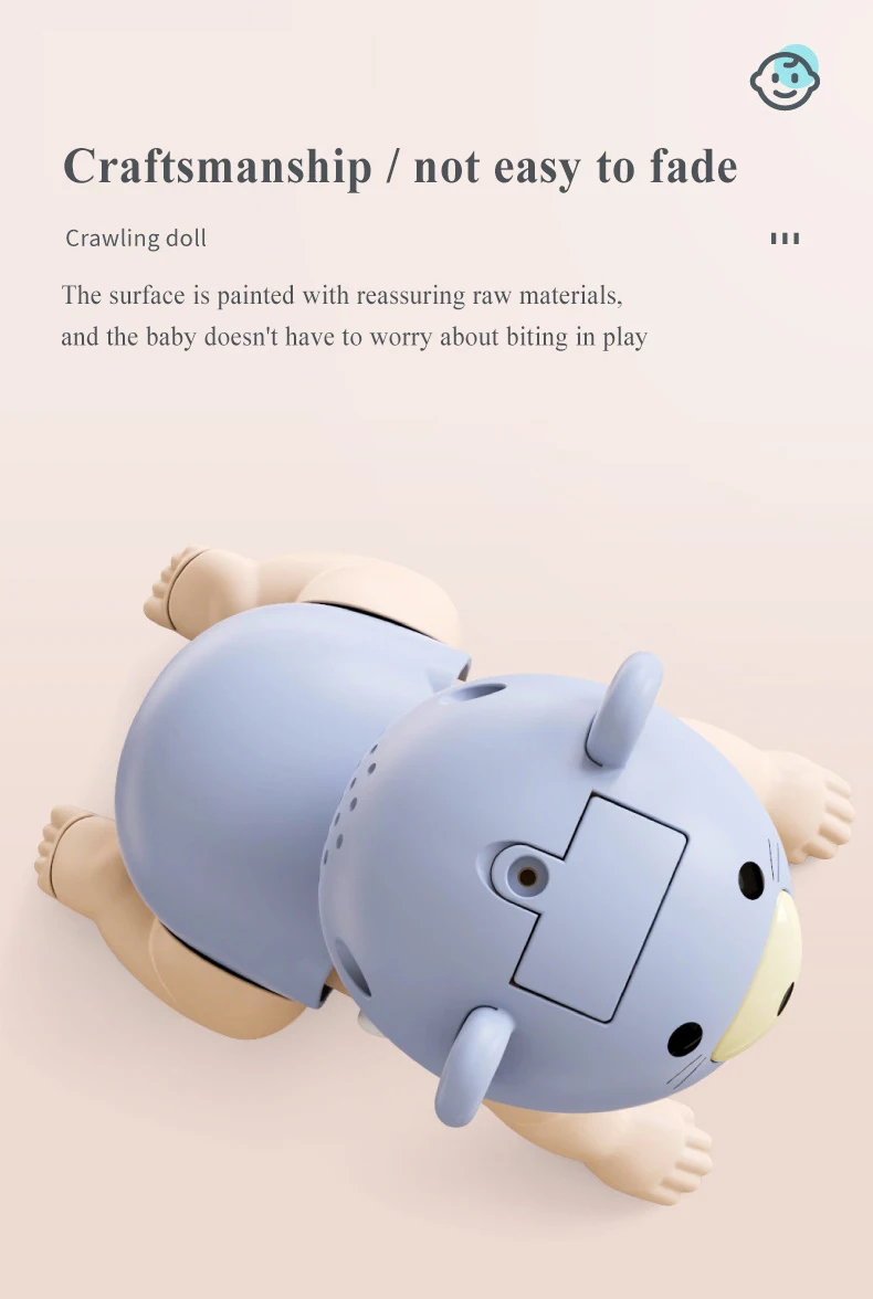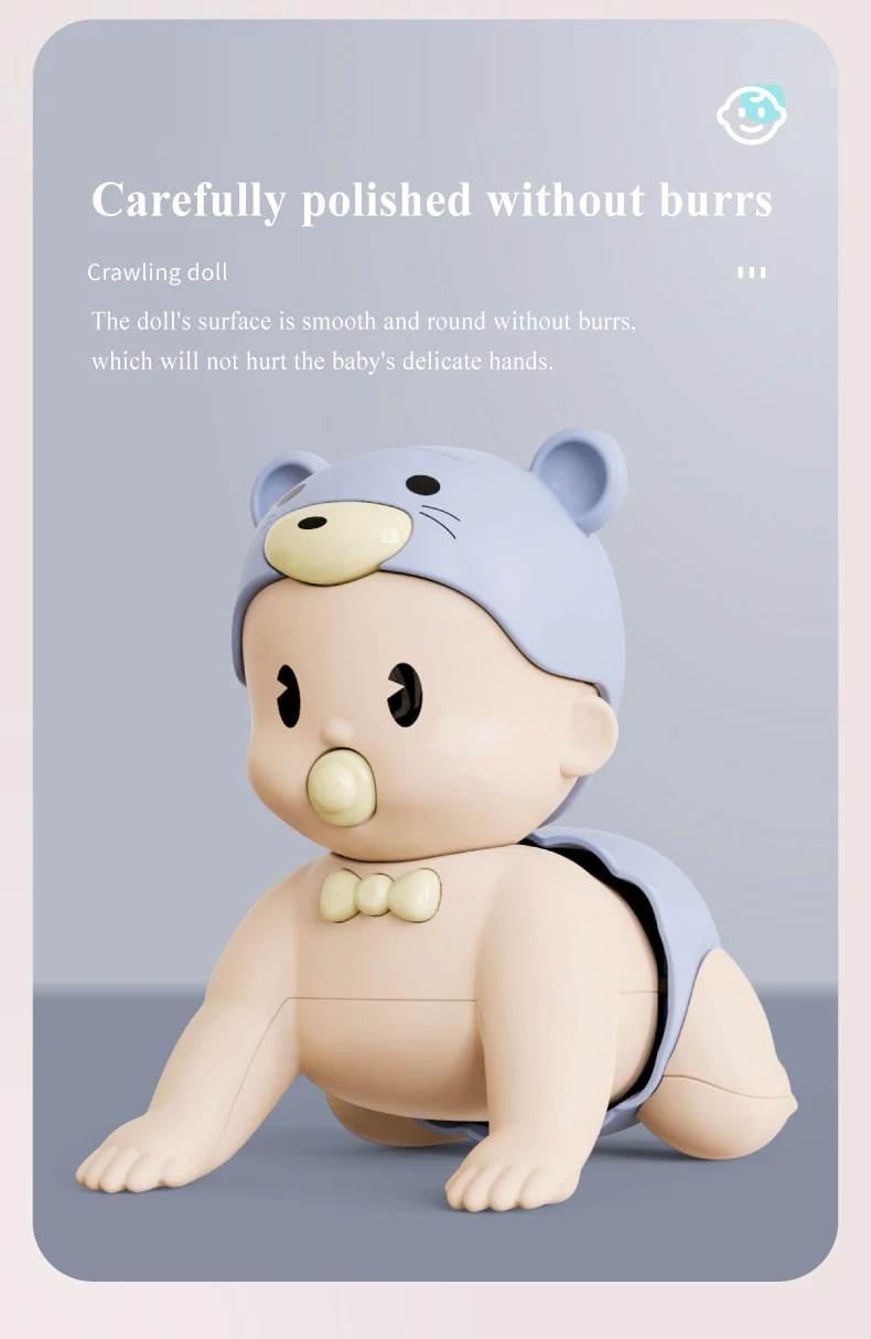 Toggle the switch on the side of the doll to activate its crawling movements, providing a simulation that guides babies to crawl. The doll's surface is colored using safe materials, ensuring worry-free play and allowing babies to bite without concerns. The accompanying crawling doll sings nursery rhymes to capture the baby's attention and encourage crawling. With a smooth and round surface, the doll is designed without any burrs to ensure the safety of your baby's hands. Exquisitely crafted with high impact resistance, the doll features bright and soft colors that your baby will love.