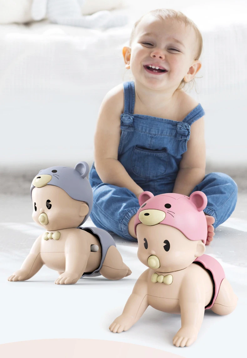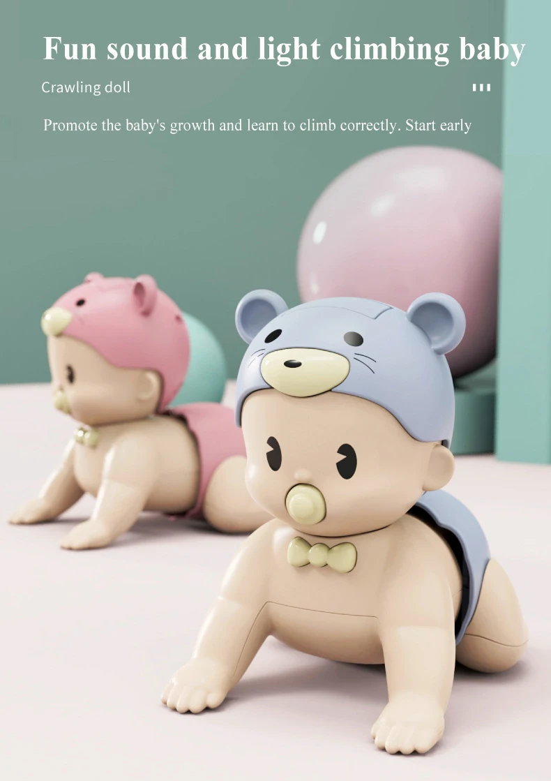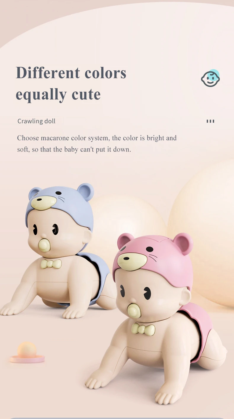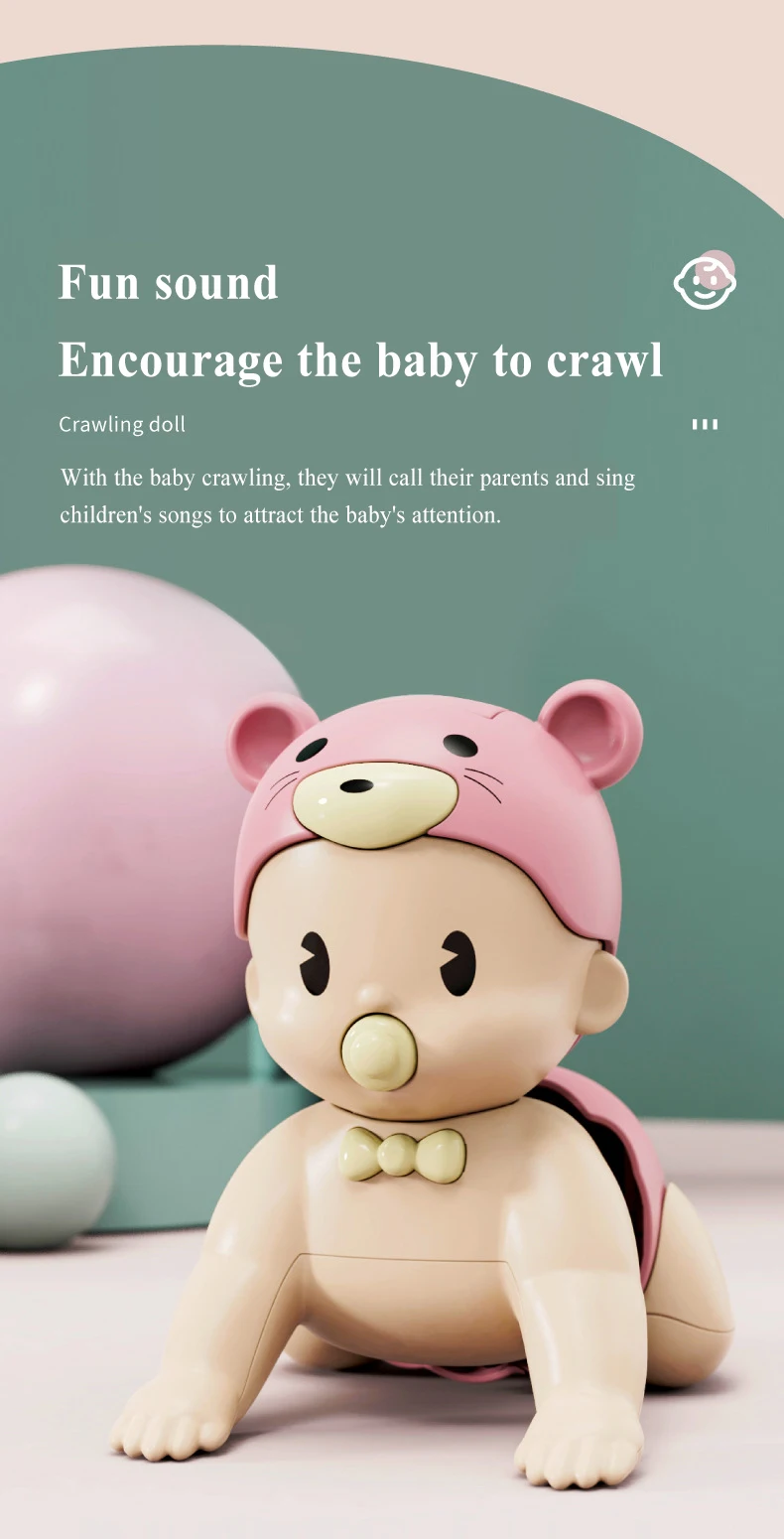 Toggle the switch on the side of the doll to activate its crawling movements, providing a simulation that guides babies to crawl. The doll's surface is colored using safe materials, ensuring worry-free play and allowing babies to bite without concerns. The accompanying crawling doll sings nursery rhymes to capture the baby's attention and encourage crawling. With a smooth and round surface, the doll is designed without any burrs to ensure the safety of your baby's hands. Exquisitely crafted with high impact resistance, the doll features bright and soft colors that your baby will love.