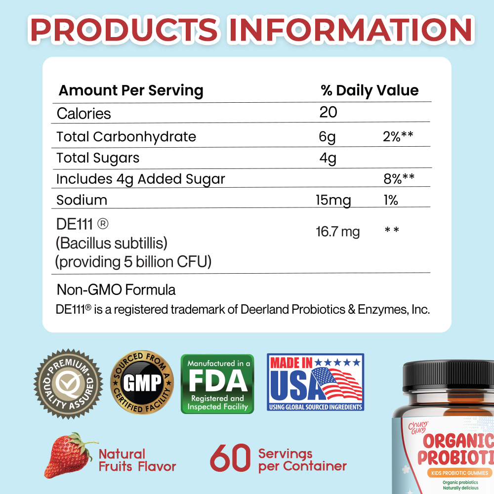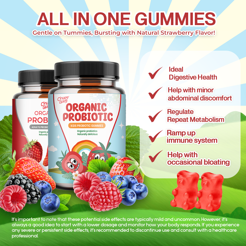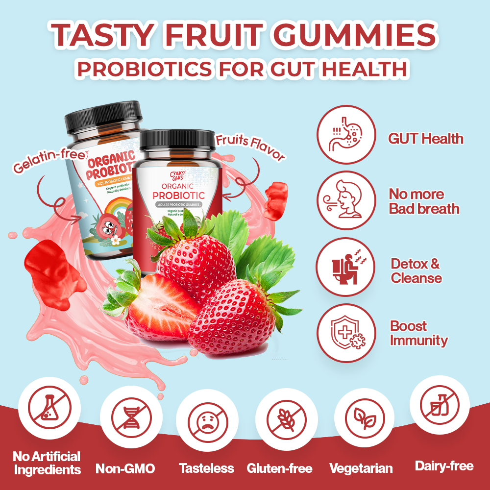 Formulated with organic ingredients, these delicious strawberry-flavored gummies make daily probiotic intake simple and enjoyable. The gummies contain organic tapioca syrup, organic cane sugar, and natural vitamins, ensuring safety and quality for every age group in your family.