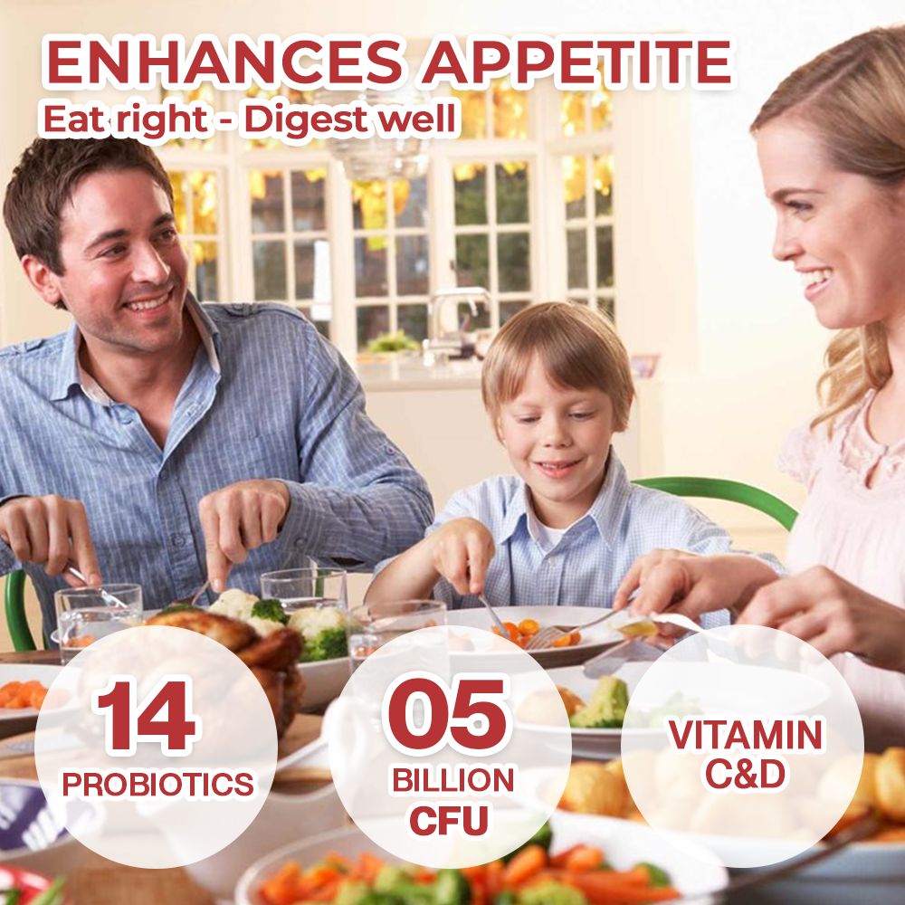 Probiotics are more than just gut health. The adult formula also aids weight management and promotes radiant skin by balancing gut bacteria, leaving you feeling light, healthy, and refreshed. For kids, the probiotics help improve appetite and nutrient absorption, supporting their energy, growth, and overall well-being.