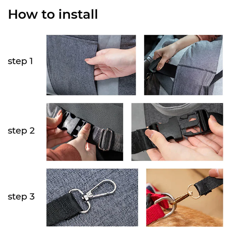 Changeable safety leashes and fastened seat belts. Integrated secure buckle for use with the dog's collar.