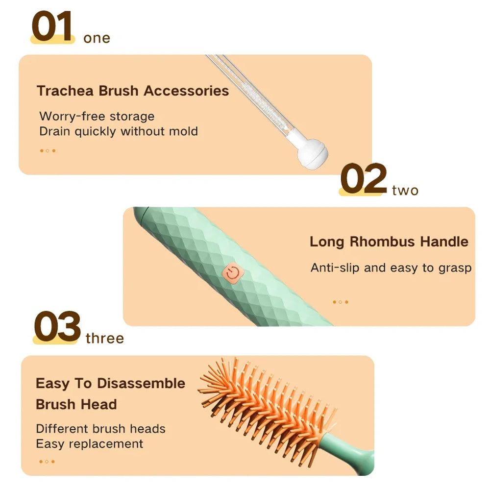 Equipped with a powerful motor and 360° rotating silicone brush, it effortlessly removes stubborn milk, tea, and residue from bottles without scratching.