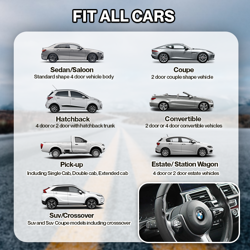 Our steering wheel covers are designed to fit most vehicles including cars, trucks, sedan, vans and SUVs. Rear seat cover designed to accommodate 50/50, 40/60, 60/40, and 40/20/40 split benches.